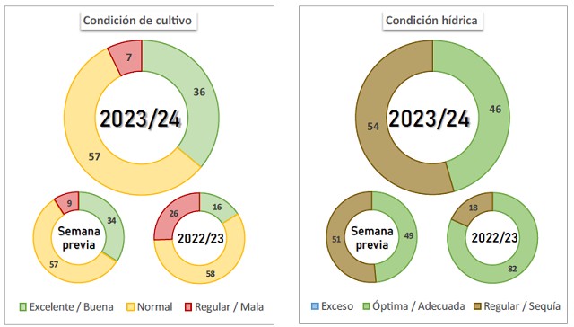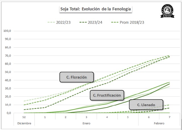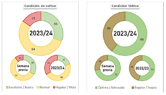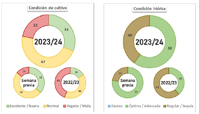 Mientras el 41,4 % de la soja de primera transita estadios de definición de rendimiento, el 39 % de los cuadros presenta una condición hídrica Regular/Sequia. El 37,1 % de los lotes de segunda ha iniciado estadios reproductivos, bajo condiciones de estrés hídrico.
