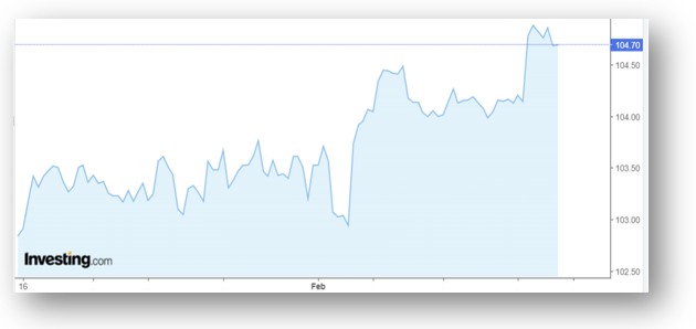 Acá vemos la evolución del índice dólar, desde el 16 de enero a la fecha.