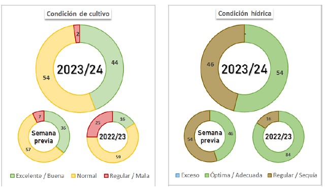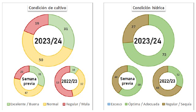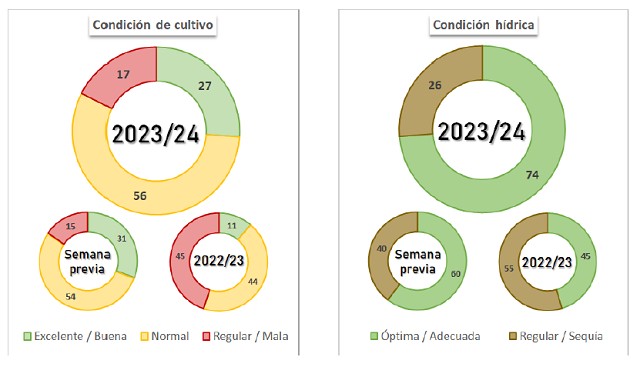 Se recupera la condición de cultivo, con un 81 % de los cuadros entre Normal a Buena. A su vez mejora la condición hídrica, con el 73 % de los lotes entre Adecuada a Óptima. El 12,9 % ha iniciado el llenado de grano.