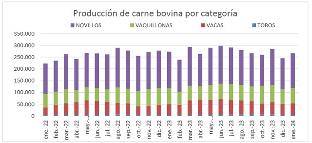 La producción de carne de novillos y novillitos cayó en (-5,0%) al comparar el periodo enero de 2024 con el primer mes del año 2023, pasando de 155,5 mil toneladas a 147,8 mil. La producción de carne de toros se incrementó en (+9,8%), de 5,8 mil a 6,4 mil toneladas; mientras que la disponibilidad de carne de vacas creció en un (+5,2%), trepando de 44,7 mil a 47,0 mil toneladas res. Finalmente, la producción de carne de vaquillonas cae de forma moderada, un (-3,2%), de 67,3 a 65,1 mil toneladas res con hueso.