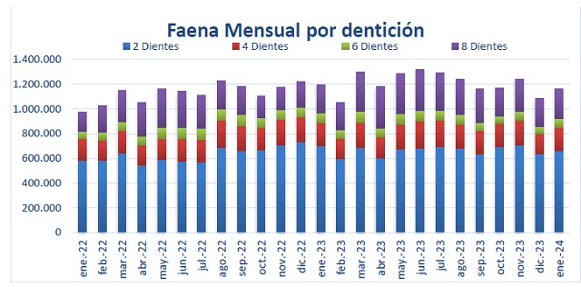 Faena mensual: 1,158 millones de cabezas. Producción: 266,3 mil toneladas. Alza de la producción de un (+8,6%) con respecto al mes de diciembre del año pasado. Caída de la producción de un (-2,5%) con respecto al mes de enero del año 2023. Participación ABC: 37,4% de la faena total.