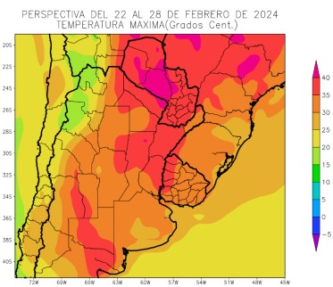 • El este del NOA, la mayor parte de la Región del Chaco, gran parte de la Mesopotamia, el este de Cuyo, el nordeste y el sudoeste de la Región Pampeana y el noroeste del Uruguay observarán temperaturas máximas superiores a 35°C con un amplio foco con valores superiores a 40°C que se ubicará sobre el centro del Paraguay y el nordeste de la Región del Chaco y otros focos con valores inferiores.