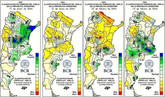 Entre diciembre y el 17 de enero se consolidó una mejora hídrica notable en los perfiles de los suelos en gran parte del área productiva Argentina. Sumado al pronóstico de un fenómeno Niño de nivel fuerte a moderado, hace un mes atrás se preveía una mejora de los guarismos de producción de soja en Argentina, con muy buenas posibilidades de superar cómodamente los 50 Mt. Pero a partir del 17 de enero se instaló una ola de calor muy larga y severa que dio vuelta el escenario. Además, ocurrió en un momento muy sensible de la soja de 1ra que forzó el aborto de chauchas. Si se compara esta estimación con la proyección de principios de enero, el deterioro de los cultivos llevó a un fuerte recorte de 2,5 Mt. Este recorte no ha sido mayor gracias a las lluvias claves que cayeron entre el 7 y el 14 de febrero. Las imágenes de anomalía de reservas de humedad muestran las situaciones mencionadas. Siempre teniendo en cuenta que queda un buen trecho hasta la cosecha, la realidad es en muy poco tiempo se han producido enormes cambios en el escenario agrícola.