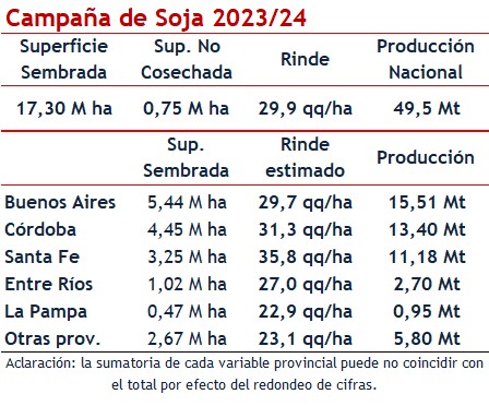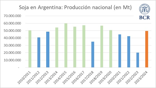 Entre el 2010 y el 2020, Argentina habría superado la valla de 50 Mt de producción en soja en 7 oportunidades. Del 2020 en adelante, este ciclo 2023/24 se presentaba con la oportunidad de superar ese nivel. Lamentablemente, en virtud de la condición del cultivo la primera estimación realizada apunta a una cantidad por debajo de lo esperable en las primeras proyecciones, calculándose ahora la posibilidad de obtener 49,5 Mt.