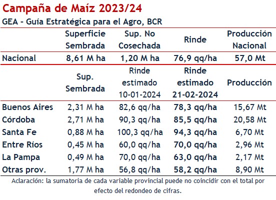 Sin cambios en las cifras de superficie, en las principales provincias productoras, los rindes se han ajustado a la baja. En Buenos Aires el recorte fue de 4,3 qq/ha, en Córdoba de 4,8 qq/ha y en Santa Fe de 6,1 qq/ha frente a lo estimado en enero. Sólo en Entre Ríos es posible estimar una mejora de resultados respecto a 30 días atrás.