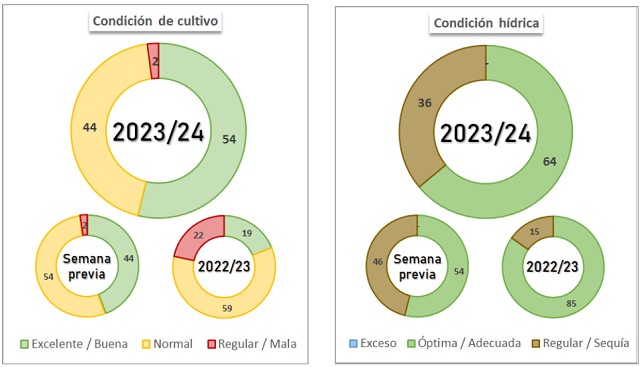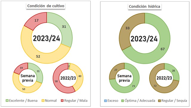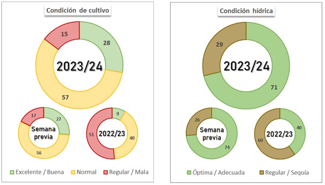 La condición de cultivo entre Normal y Excelente asciende 2,7 puntos porcentuales respecto a la semana anterior, alcanzando al 85,3 % de los cuadros a nivel nacional