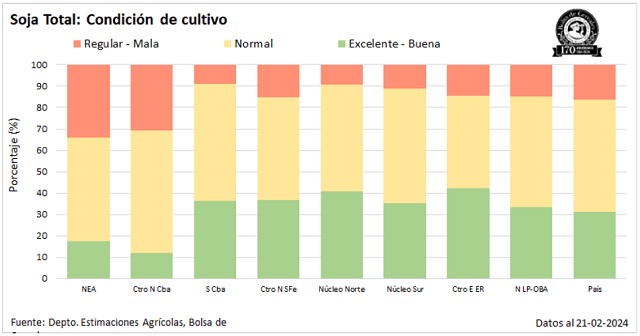 El 67,7 % de los cuadros de soja de primera presenta una condición hídrica Óptima/Adecuada, con 4 MHa habiendo iniciado el llenado. A su vez, 820 mHa de soja de segunda ya han iniciado el periodo crítico, con un 66 % bajo una condición hídrica Óptima/Adecuada