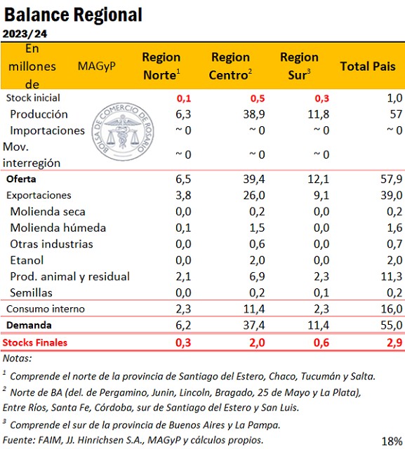 Respecto de la Región Norte, se observa que el 35% de su producción (2,1 Mt) es utilizada para la alimentación de ganado, mientras que alrededor de 160.000 t serán destinadas a la industria (molienda húmeda y elaboración de balanceados). El 62% restante (3,8 Mt) es destinado a la exportación, por lo que bajará de la región hacia el Gran Rosario para ser despachado por puertos fluviales Paraná.