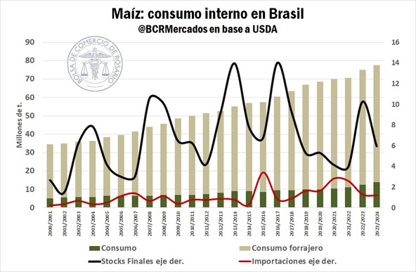 Por su parte, una porción del consumo doméstico industrial de Brasil se destina a la producción de bioetanol, demanda que también ha crecido a pasos agigantados. Si bien a diferencia de Argentina el insumo principal para el biocombustible en el país vecino es la caña de azúcar, el maíz ganó protagonismo durante las últimas campañas.