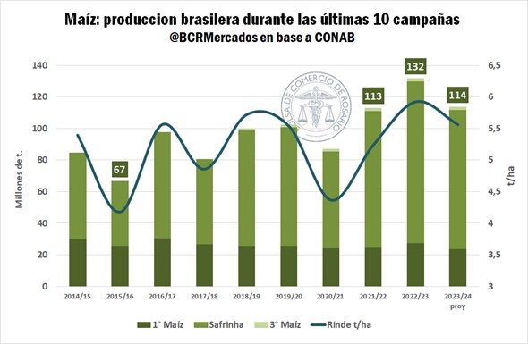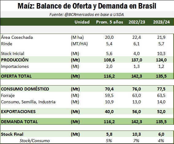 Más allá de lo anterior, se coincide en que Brasil contará con una muy buena cosecha en términos históricos. En este sentido, aunque se cumplan las más pesimistas de las proyecciones, el país vecino estaría barajando 6% más maíz que el promedio de las últimas cinco campañas y se encontraría dentro de las mejores tres cosechas de su historia.