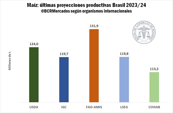 Para la nueva cosecha, las proyecciones iniciales del USDA auguraban nuevamente cifras monstruosas rondando los 130 Mt para maíz. Sin embargo, las adversidades climáticas que han tenido que atravesar las principales regiones productivas brasileras, especialmente a inicios de la siembra y durante los primeros estadios de desarrollo del cultivo, conllevaron a sucesivas revisiones a la baja durante los últimos meses y han despertado controversias sobre las proyecciones a cosecha de los principales organismos estimadores, notando cierta amplitud entre las distintas previsiones.