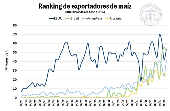 En efecto, el gigante sudamericano consiguió en la campaña 2022/23 un récord productivo de 132 millones de toneladas, lo que le permitió consolidarse como principal exportador de maíz a lo largo y ancho del globo.
