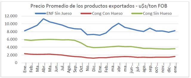 En enero de 2024, se exportaron 12,0 mil toneladas de carne congelada con hueso y huesos producto de la despostada, casi exclusivamente con destino a la República Popular China. El valor obtenido por las ventas al exterior dentro de esta partida ascendió a 19,4 millones de dólares, por lo que el precio unitario resultó de aproximadamente u$s 1.620 por tonelada.