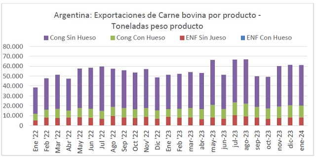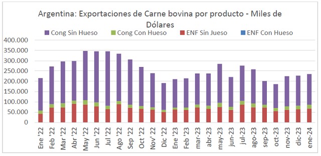 En enero de 2024, se exportaron 41,0 mil toneladas de carne bovina congelada sin hueso, por un valor de 148,4 millones de dólares. El precio promedio de las exportaciones de carne bovina congelada sin hueso resultó cercano a los 3.615 dólares por tonelada. Como consecuencia mayores volúmenes despachados a Israel, compensados por menores embarques destinados a Estados Unidos y a China, los volúmenes exportados de carne congelada deshuesada caen levemente, con una variación de un (-0,1%) con respecto al mes precedente; y sin embargo resultan (+18,2%) superiores a los volúmenes embarcados en enero de 2023.