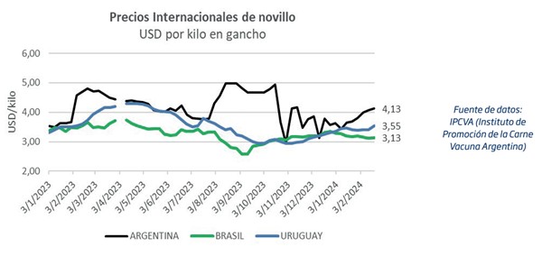 Los valores para el novillo pesado tipo exportación muestran un Brasil sumamente competitivo. Desde el comienzo de año a la fecha, la referencia para el novillo gordo en San Pablo retrocedió un 6% en dólares para ubicarse en torno a los USD 3,13 por kilo en gancho y consolidarse con el valor más bajo de la región, 25% por debajo de lo que se paga por el novillo argentino, actualmente en USD 4,13 el kilo.