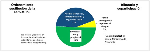 Actualmente la presión tributaria nacional y provincial es de 28% del PBI. Un 14% del PBI son impuestos que se coparticipan en mitades (7% para la Nación y 7% para las provincias). La Nación se queda con 16% del PBI porque, al 7% de la coparticipación, agrega 9% del PBI con impuestos al comercio exterior, seguridad social y cheque. Las provincias se quedan con 12% del PBI, porque a su 7% de la coparticipación le suman los impuestos provinciales.