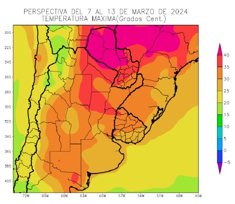 El oeste del NOA, la mayor parte de Cuyo, gran parte de la Mesopotamia, el sur de la Región del Chaco, gran parte de la Mesopotamia, el norte y el oeste de la Región Pampeana y la mayor parte del Uruguay observarán temperaturas máximas superiores a 30°C, con focos con valores superiores a 35 y 40°C y otros focos con valores inferiores.