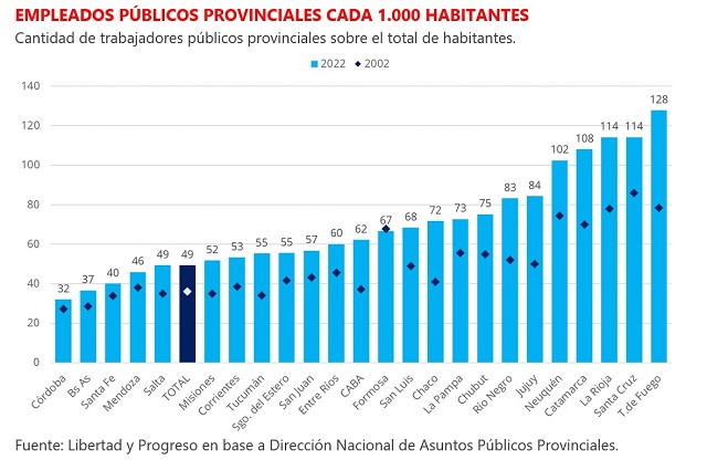 Bajo esta métrica, Tierra del Fuego ocupa el primer lugar con 128 empleados públicos provinciales por cada 1.000 habitantes. Esto es 50 trabajadores más que en 2002. Además, Santa Cruz, La Rioja, Catamarca y Neuquén completan la lista de provincias que superan los 100 empleados públicos provinciales por cada 1.000 personas.