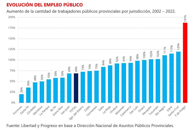 La expansión en el empleo público fue transversal, en otras palabras, no hubo una sola jurisdicción donde el empleo público se mantuviese estable o se redujera. El mayor crecimiento se registró en Tierra del Fuego (+197%), provincia que casi triplicó la cantidad de trabajadores estatales. Mientras que la menor expansión se dio en Formosa (20%). Según los especialistas este aumento "inédito" se debe a un desorden en la administración de fondos provinciales, que a lo largo de 20 años comprometieron las cuentas públicas y que hoy deben afrontar sus obligaciones.