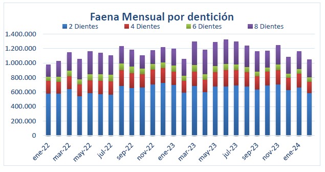 En los primeros dos meses del año 2024, se faenaron 2,20 millones de bovinos; un (-2,0%) menos que los 2,25 millones que se habían faenado entre enero y febrero de 2023. Las mayores diferencias interanuales en la faena provienen de los machos de dos dientes, que recortaron en 32,7 mil cabezas la faena acumulada en los primeros dos meses del año pasado, los machos de seis dientes, que mostraron una caída interanual de la faena de más de 27,6 mil cabezas, y, en sentido contrario, por las hembras de ocho y más dientes, cuya faena superó en cerca de 13,2 mil cabezas a la registrada entre enero y febrero del año 2023.