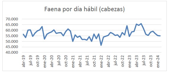 La faena diaria del mes de febrero del corriente año, se ubicó en 54,9 mil cabezas, un (-0,5%) por debajo de las 55,2 mil diarias procesadas en enero, y un (-6,0%) por debajo de las 58,5 mil correspondientes a febrero de 2023.