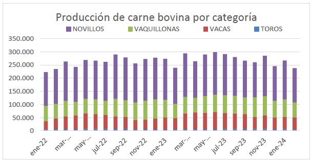La producción de carne bovina obtenida en febrero de 2024 resultó cercana a las 237,6 mil toneladas equivalente res con hueso, que implica una caída de un (-10,9%) con respecto al mes de enero; y una caída de un (-0,6%) con respecto al mes de febrero del año 2023. En los primeros dos meses del año 2024, se produjeron poco más de 504,3 mil toneladas equivalente carcasa; un (-1,6%) menos que las 512,4 mil toneladas obtenidas entre enero y febrero de 2023.