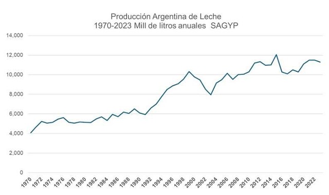 Pasan los años y seguimos viendo en Argentina que la producción láctea sigue estancada en una producción anual de 10,5 a 11,5 mil millones de litros desde hace algo más de 20 años.