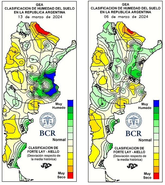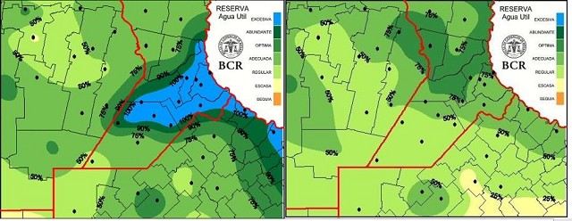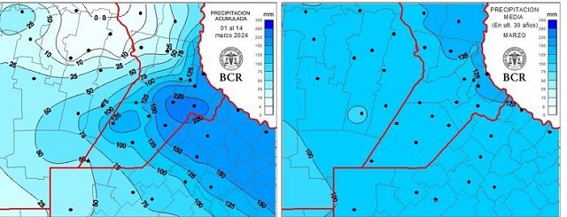 En marzo suelen llover entre 90 y 130 mm y en lo que va del mes la región ya promedia 94 mm. Con las lluvias de los primeros 14 días de marzo, el 25% de la región alcanzó el promedio histórico y algunas localidades hasta lo duplicaron. Es el caso de Bigand que acumuló 274 mm y Santa Teresa con 250 mm. El sudeste de Santa Fe y noreste de Buenos Aires son las zonas que recibieron los mayores milimetrajes. En Santa Fe, Labordeboy marcó 182 mm y Rosario, 174 mm. En el norte de Buenos Aires, Baradero alcanzó 214 mm y Ramallo, 205 mm. Ahora hay excesos en los suelos. En el resto e la región los milimetrajes estuvieron por debajo de los 100 mm. En el noroeste bonaerense, Lincoln acumuló 81 mm; Gral. Pinto, 72 mm. En el sudeste de Córdoba, Guatimozín marcó 74 mm y Pozo del Molle, 2 mm. En el en el centro sur de Santa Fe, Irigoyen registró 23 mm y Carlos Pellegrini tan solo 3 mm. Las reservas de agua de la región muestran un cambio sustancial respecto a una semana atrás.