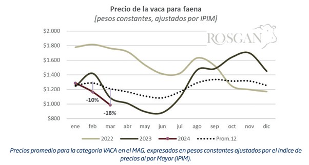 Sin dudas, dentro de la categoría, la hacienda que más deprimida se encuentra es la vaca tipo conserva de inferior calidad, justamente aquella cuya salida comenzará a agilizarse en los próximos meses, en función de los resultados de preñez y la necesidad de aliviar carga, previo a la entrada del invierno. En efecto, a valores actuales en torno a los $900 el kilo, cada vaca flaca que sale del campo pierde un 25% en relación a lo obtenido un año atrás, medido a valores de hoy.