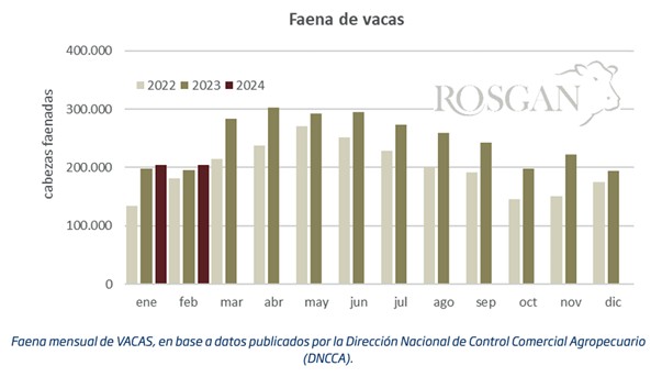 Actualmente, los datos de faena de los dos primeros meses muestran un arranque muy firme. En términos absolutos unas 407.920 vacas faenadas entre enero y febrero de este año contra 392.950 en igual período de 2023.