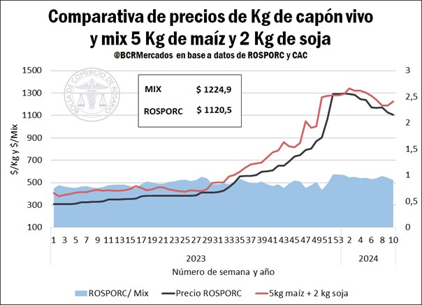 • “Mix 5 kg de maíz + 2 kg de soja”: la merma experimentada en el precio del capón en las últimas dos semanas, en conjunción con la parcial recuperación en los precios del maíz y de la soja en el mercado interno, hicieron que se incremente la brecha entre el capón y el mix maíz-soja. El capón alcanzó en la semana 10 un precio que representó el 91,5% del valor del mix, cayendo 7 puntos porcentuales en este período. El valor del mix se ubicó en $ 1.224,9 en la última semana, mientras que el kilo de cerdo vivo se posicionó en $ 1120,5/kg; esto deriva en un “retraso teórico” en el valor de los cerdos locales respecto a estos insumos, luego de haber alcanzado una igualdad teórica en la semana 8.