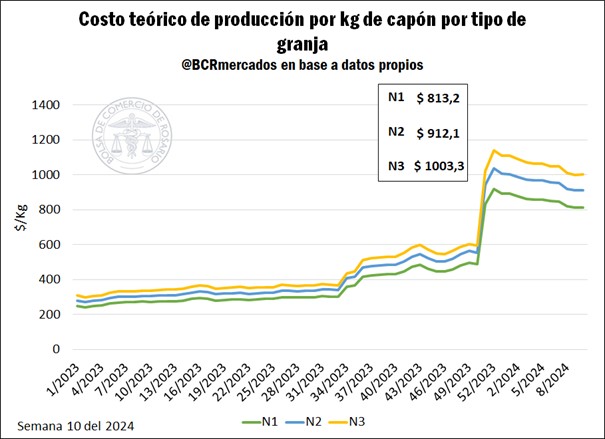 • Evolución de los costos de cerdos: Los costos productivos mantienen una tendencia bajista desde fines de 2023, pero aumentaron levemente en la última semana, como resultado de la recuperación del maíz y del poroto y el aceite de soja, parcialmente compensada por una caída en la harina de soja. Para la semana 10 del 2024, los costos promedios de las granjas N1 fueron de $ 813,2 por kilogramo de capón, para los establecimientos N2 de $ 912,1 /kg y para las N3 de $ 1003,3 /kg, aumentando un 2,6% en la última semana, pero presentando una caída del 9,2% en lo que va del año.