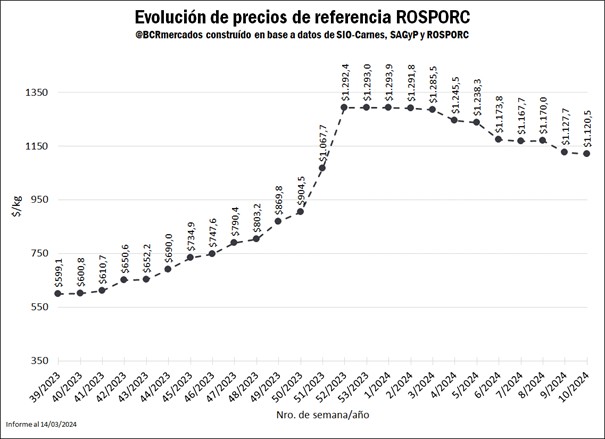 El Precio de Referencia para los capones, calculado bajo la metodología de cálculo de ROSPORC, Mercado digital de cerdos de la Bolsa de Comercio de Rosario, alcanzó durante la semana del 04 al 10 de marzo un valor de $ 1.120,5 /kg, implicando una caída del 0,6% con respecto a la semana previa y un incremento del 237,7% respecto a la misma semana del año previo. Continúa la tendencia decreciente desde fines del año pasado, ya que en lo que va del año los precios cayeron un 13,4% en términos nominales, luego de la fuerte suba experimentada tras la devaluación de diciembre. Los factores explicativos detrás de esta merma han sido las disminuciones en los precios del maíz, la harina y el aceite de soja en las últimas semanas, que constituyen importantes costos de producción, a lo que se suma el debilitamiento de la demanda resultante de la caída en la actividad económica.