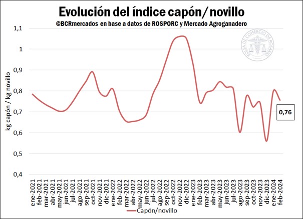 • Índice Capón/Novillo: Luego de un final de 2023 en el que el precio del capón llegó a representar tan solo el 56% del precio del novillo, esta relación sintió una corrección en el primer mes de 2024 en favor de los capones, que en febrero volvieron a debilitarse. La fuerte suba en el precio del capón en enero (+44%) elevó significativamente el índice capón/novillo en dicho mes, ya que los bovinos sólo aumentaron un 1%. Sin embargo, en febrero se reajustaron los precios relativos, al subir el capón un 12%, por debajo del aumento de los novillos, del 19%. De este modo, el índice capón/novillo cerró el mes de febrero en un promedio de 0,76, tres puntos porcentuales por debajo del promedio de los últimos 3 años, de 0,79.