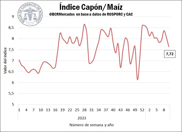 • Índice Capón/Maíz: Luego de sufrir el maíz una caída de precios del 12% entre la segunda y la octava semana del año, en las últimas dos semanas el cereal recuperó terreno en el mercado doméstico, aumentando un 4% su cotización en pesos argentinos corrientes. Al mismo tiempo, en la última quincena el precio del capón sufrió una caída del 4%. De esta manera, el ratio Capón/Maíz alcanzó un valor de 7,72 para la décima semana del año, retrocediendo un 7,6% en las últimas dos semanas.