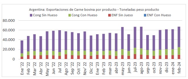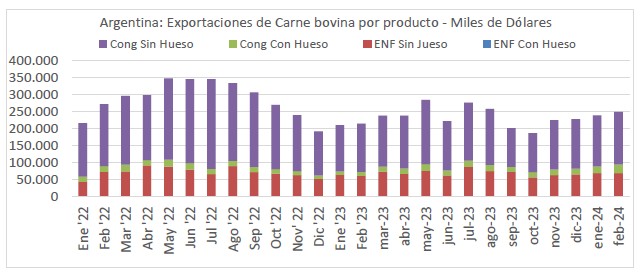 En febrero de 2024, se exportaron 42,5 mil toneladas de carne bovina congelada sin hueso, por un valor de 154,7 millones de dólares. El precio promedio de las exportaciones de carne bovina congelada sin hueso resultó de 3.642 dólares por tonelada. Como consecuencia de mayores embarques con destino a China, los volúmenes exportados de carne congelada deshuesada crecen levemente, con una variación de un (+2,6%) con respecto al mes precedente; y además resultan (+20,5%) superiores a los volúmenes embarcados en febrero de 2023. En los primeros dos meses del año 2024, las exportaciones de esta partida alcanzaron las 83,9 mil toneladas; un (+19,9%) por encima de las 70,0 mil toneladas registradas entre enero y febrero de 2023. El ingreso de divisas por exportaciones de carne bovina congelada deshuesada a lo largo de los primeros dos meses de 2024 resultó cercano a 304,6 millones de dólares; un (+9,2%) superior a los 279,0 millones que se habían facturado entre enero y febrero de 2023.