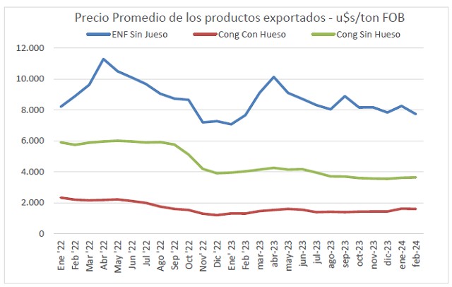 El precio promedio de exportación de carne bovina refrigerada y congelada resultó en el mes de febrero de 2024 de u$s 3.703 por tonelada. Este valor resulta un (-3,8%) inferior al obtenido en enero último; y un (-9,6%) más bajo que el precio medio de febrero de 2023, que había sido de u$s 4.098 por tonelada. En los últimos años, se observa una persistente tendencia a la baja de los precios en los principales destinos desde el mes de mayo de 2022 en adelante; y los u$s 3.703 dólares promedio por tonelada obtenidos en el mes de febrero se ubican u$s 2.600 por tonelada por debajo de los máximos registrados en abril de 2022.