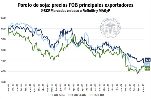 El derrotero va de la mano con menores precios de exportación por soja. Los tres principales países exportadores han recorrido la misma senda negativa desde los USD 600/t en enero del 2023 a converger hacia un rango de USD 420-440/t.