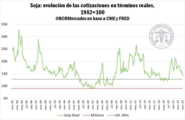 En términos reales, los valores actuales de la soja son tan bajos como en agosto del 2020 y comparables a los niveles observados durante los años 2015 a 2019.