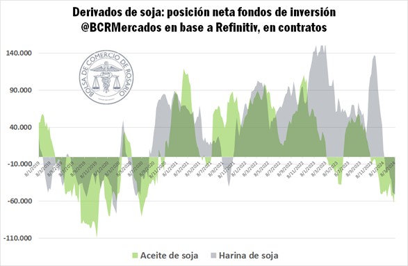 Situación análoga la de las posiciones en los derivados, en donde los fondos se encuentran netamente vendidos tanto en harina como en aceite.