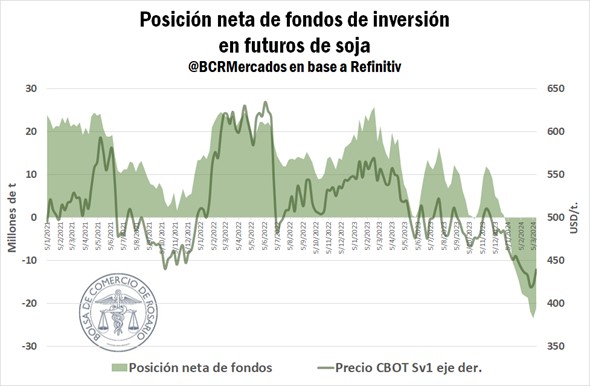 Tras cuatro años consecutivos con una posición netamente comprada en soja y de llegar el año pasado a mantener un saldo neto positivo de 25,7 Mt, los fondos han comenzado a desarmar su posición de forma progresiva y acelerando fuertemente a fines del 2023.