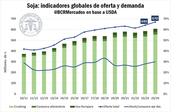Con una oferta total que se incrementaría al 5% anual y una demanda proyectada que lo haría al 3,5%, los stocks finales esperados para la campaña siguiente serían los más holgados en cuatro años y los segundos más amplios de la historia dejando una relación stock/consumo de 30%, solo por debajo de la campaña 2018/19.