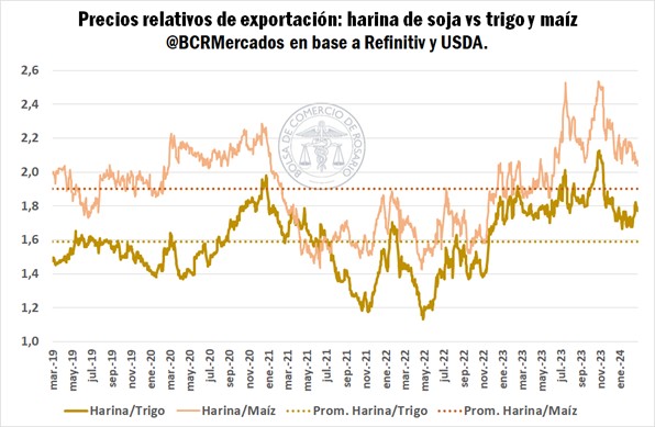 Llevando a cuenta que la harina de soja, insumo clave para la nutrición animal, compite con otros granos sustitutos como el maíz, el sorgo o el trigo, que también se utilizan en parte para consumo forrajero, y que éstos se han estado abaratando significativamente en el último año, es fundamental monitorear la relación de precios entre estos productos.