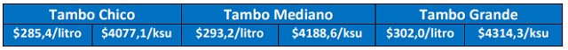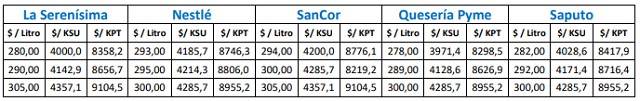 En la Cuenca Oeste de Bs. As., para una leche libre de Brucelosis y Tuberculosis, con 3.65% grasa y 3.35% proteína, 25.000 UFC, 300.000 CCS, y remitida a 4.0 ºC. Se trata de una estimación genérica y -como tal- sólo orientativa, referida a algunas de las principales empresas que operan en la Región. Se toma “anillo 2” en el caso de La Serenísima. La 1º fila, se refiere a un tambo de 2500 litros/día, la 2° corresponde a un tambo de 5000 litros/día, y la 3º hace referencia a un tambo de 10000 litros/día. Los precios se expresan en $/Litro, $/KSU (Kg de sólidos útiles), y $/KPT (Kg de proteínas totales).
