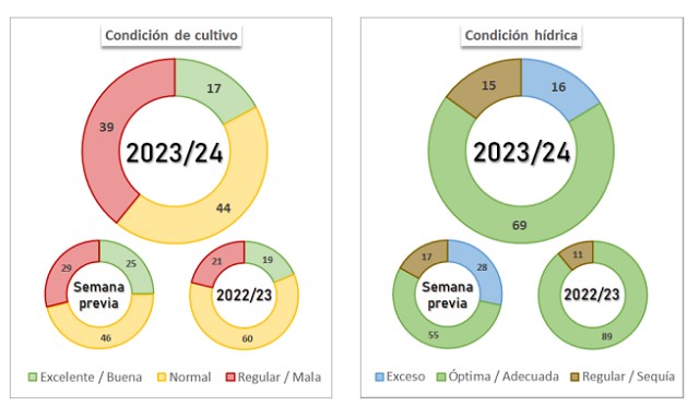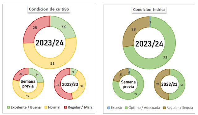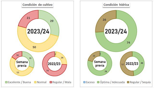 En cuanto al girasol, el progreso intersemanal de cosecha fue de 15,8 puntos porcentuales, alcanzando el 75 % del área apta. Si bien transcurrieron 7 días sin lluvias, hay sectores que aún no presentan condición de suelo idónea para la entrada de las máquinas, y debido a ello, se mantiene una demora interanual y respecto al promedio de las últimas 5 campañas de -2 y -8,8 puntos porcentuales respectivamente. A pesar de la variabilidad de los rendimientos cosechados, el promedio nacional se mantiene en 20,2 qq/Ha, sosteniendo la proyección de producción nacional en 3,6 MTn. Colaboradores del sur del área agrícola informan pérdidas de área y mermas de rinde luego del temporal de las últimas dos semanas, que continuarán evaluándose conforme avance la recolección de los lotes.