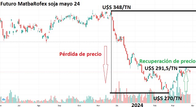 Ante la actual baja de precios, los rendimientos debieran crecer 20% a 10% respecto de lo presupuestado el año pasado, lo que en muchas zonas será inviable por las inclemencias climáticas y sanitarias sufridas durante la campaña. Es importante entonces recordar que, disminuir el riesgo de baja de precios a través de herramientas comerciales, como futuros y opciones agrícolas, permite cubrir precios de venta de posibles bajas, con anticipación, cuando los precios futuros ofrecen rentabilidad en pre cosecha. Considerando que los precios de soja se han recuperado parcialmente de las bajas más fuertes, dado que había tocado mínimos de U$S 270/TN a fines de febrero 24, y ante presión de venta que podría haber a cosecha, cubrir parte de las ventas que planean hacerse a cosecha es recomendable. Recordar que solo hay 1,8 millones de toneladas de soja 23/24 con precio, de una cosecha que proyecta ser de 48-50 millones de toneladas, un tercio de la que podría necesitar ser liquidada en el corto plazo, generando presión de venta y por tanto profundización de baja de precios. El gráfico muestra la evolución del futuro soja mayo 24.