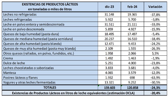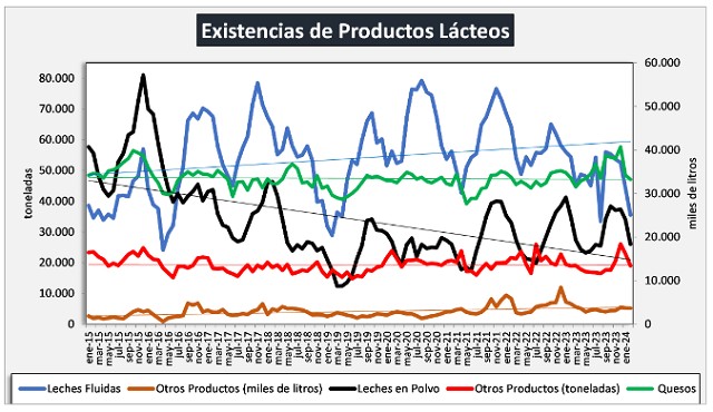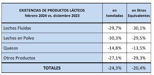 En el mes de febrero de 2024 las existencias fueron 13,9% inferiores al mes anterior (-8,0% en promedio diario) y en litros de leche equivalentes estuvieron en 844 millones de litros de leche equivalentes, un 10,4% por debajo del mes anterior (-4,2% en el promedio diario).