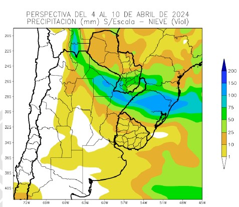 La perspectiva comenzará con temperaturas bajo lo normal, causadas por la entrada de aire polar en los días precedentes, con alto riesgo de heladas generales en la mayor parte del Cinturón Maicero, el nordeste del área triguera y el norte de la Región Sudeste, mientras el oeste y sur del área triguera y la mayor parte del Delta observarán heladas localizadas. Los vientos del trópico regresarán con moderado vigor, incrementando la temperatura algo por encima de lo normal en el centro y el sur del área agrícola norteamericana, mientras la mayor parte del norte observará registros normales a levemente inferiores a lo normal. Paralelamente, se producirán precipitaciones abundantes en gran parte del área agrícola norteamericana, acompañadas por nevadas tardías, que cubrirán la mayor parte de su extensión, salvo un área central y su extremo sur. Riesgos: Heladas tardías en gran parte del este y todo el oeste del área agrícola norteamericana, 4 al 6 de Abril: Nevadas tardías en gran parte del este y todo el oeste del área agrícola norteamericana, 4 al 6 de Abril: Lluvias intensas sobre el Delta, con riesgo de desborde de ríos y arroyos, 7 al 10 de Abril.