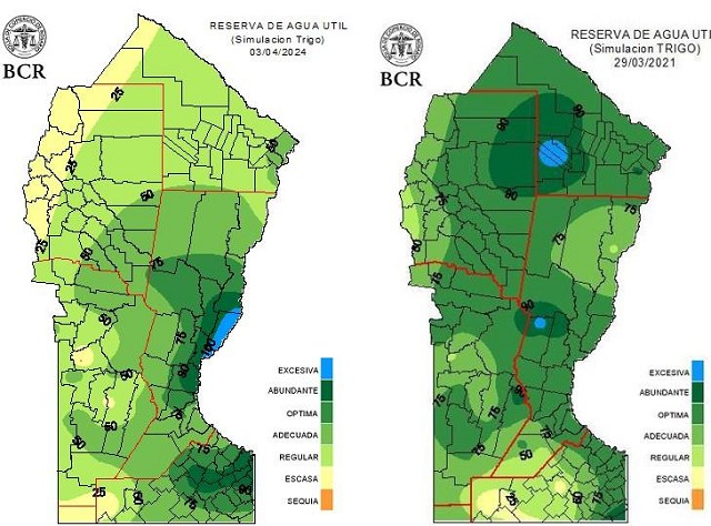 También hay que tener en cuenta en el ciclo 2021 se transitaba la 1ra Niña, por lo que aún había reservas de agua en niveles profundos del suelo (después del primer metro). En cambio en este 2024, recién ahora empieza a notarse un mejor contenido por el reciente excesos de lluvias en las napas de algunas zonas de la franja este de la región pampeana.