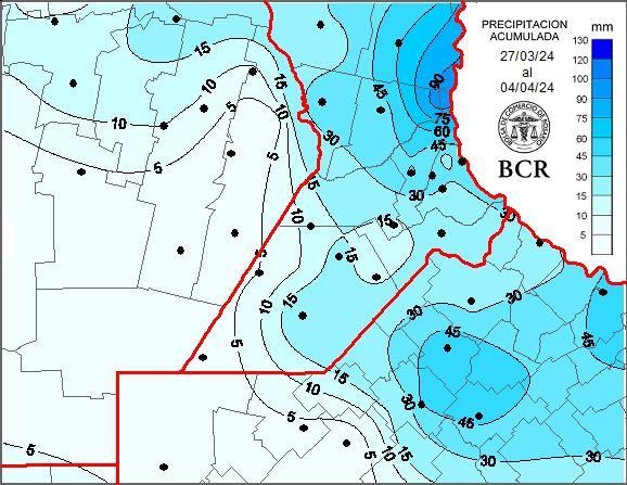 En los útlimos 8 días, los mayores acumulados se registraron en el este de la región con valores que van de los 15 a 60 mm, patrón que viene reptiendose semana a semana. El mayor monto es el de Oliveros con 90mm, que si bien no es una estación GEA/BCR es uno de los puntos que se toman para mejorar la resolución de la imagen. Le sigue Irigoyen con 59,6 mm; Rojas con 59 mm y Baradero con 52mm. En Rosario se acumularon 36 mm.